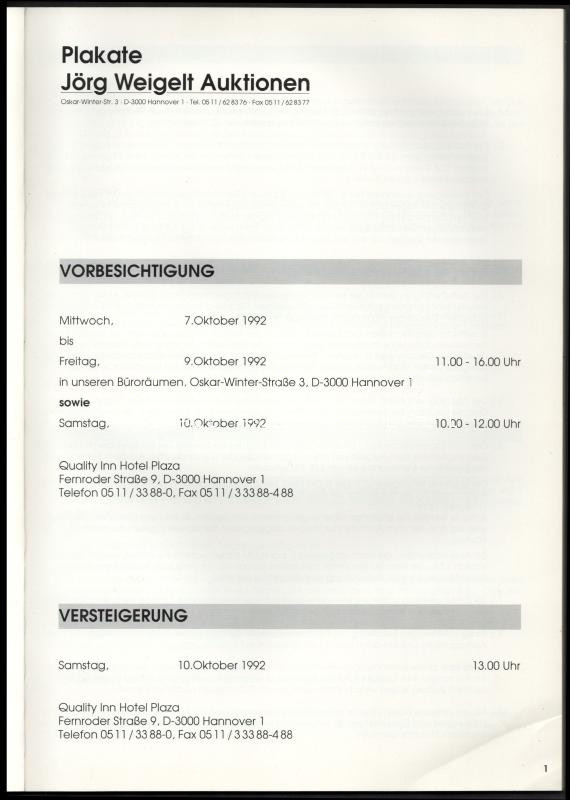 Plakate. Jörg Weigelt Auktionen 23. (Aukciós katalógus, plakát témában.) Hannover, 1992, Jörg Weigelt Auktionen. Gazdag képanyaggal illusztrálva. Német nyelven. Kiadói papírkötés.