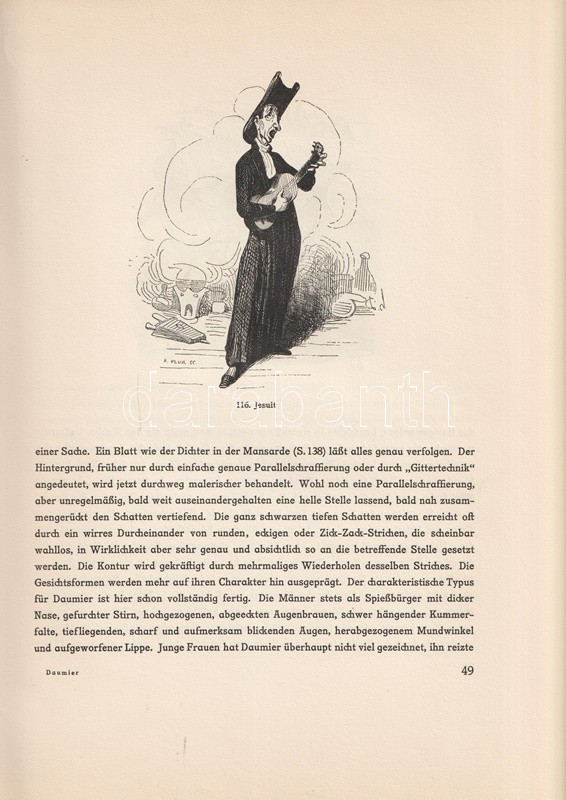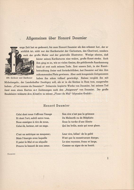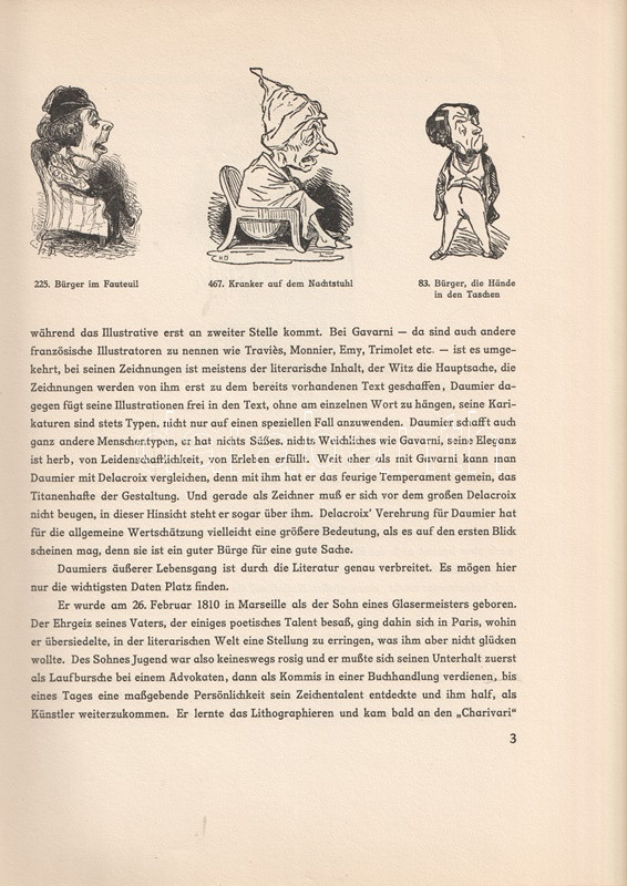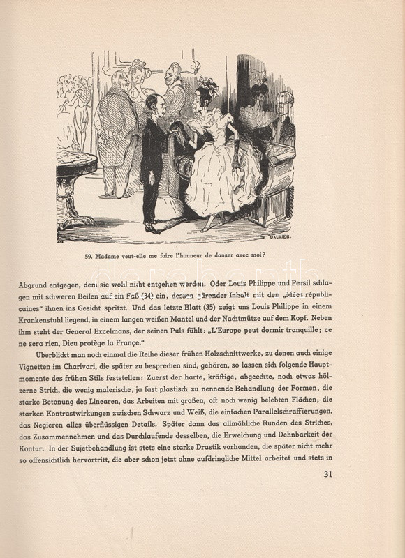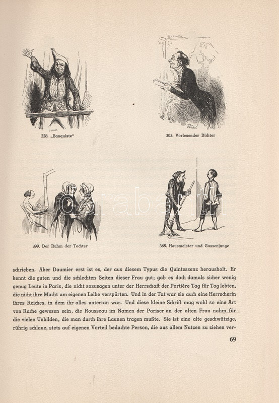 Arthur Rümann (1888-1963) német művészettörténész gazdagon illusztrált monográfiája a francia karikatúra mesterérÅ‘l, Honoré Daumier-rÅ‘l (1808-1879). Bár Daumier elsÅ‘sorban saját korának társadalmi tÃpusairól, fÅ‘ként a francia nyárspolgárokról készÃtett jelentÅ‘s erejű, groteszk karikatúrákat, monográfiánk bÅ‘ven válogat a művész történelmi karikatúráiból is, melyek a korábbi évszázadok visszásságait idézik meg.