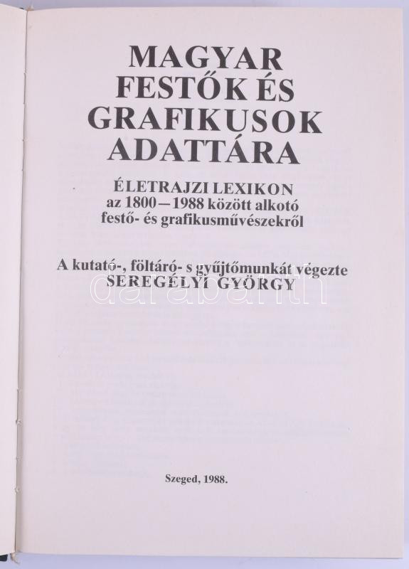 Description: Seregélyi György: Magyar festők és grafikusok adattára. Életrajzi lexikon az 1800-1988 között alkotó festő- és grafikusművészekről. Szeged, 1988, Szerzői. Kiadói aranyozott egészvászon-kötés,