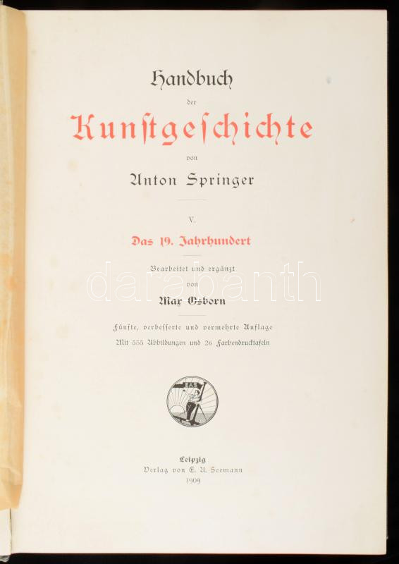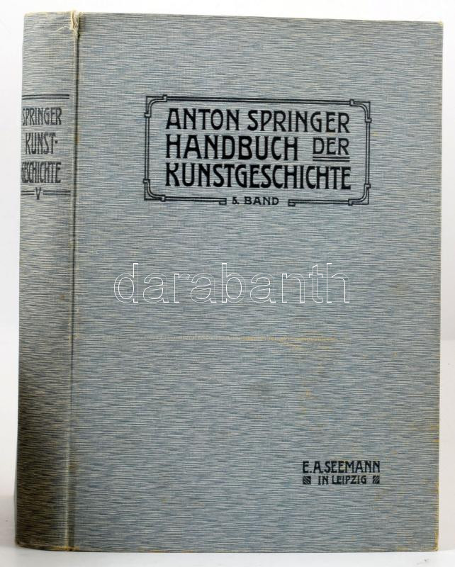 Springer, Anton: Handbuch der Kunstgeschichte. V.: Das 19. Jahrhundert. Bearbeitet und ergänzt von Max Osborn. Leipzig, 1909, E. A. Seemann, X+484 p.+ XXVI (szÃnes) t. Szövegközti fekete-fehér képekkel és szÃnes képtáblákkal illusztrálva. Német nyelven. Kiadói egészvászon-kötés, a gerincen kis sérüléssel, belül nagyrészt jó állapotban, helyenként kissé foltos lapokkal.