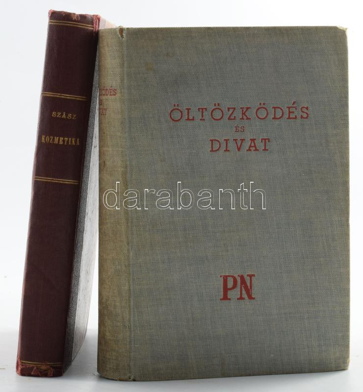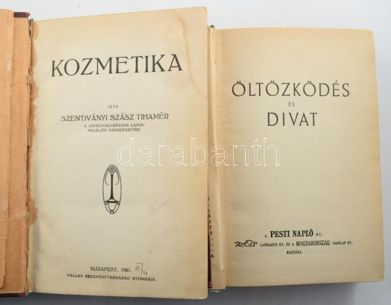 Szentiványi Szász Tihamér: Kozmetika. Bp., 1921, "Pallas", 257+1 p. Átkötött félvászon-kötés, kopott borítóval, foltos lapokkal, laza fűzéssel. + Öltözködés és divat. Szerk.: Lackó Géza. Bp.,é.n.,Pesti Napló. Fekete-fehér szövegközti illusztrációkkal. Kiadói egészvászon-kötés, kopott borítóval.