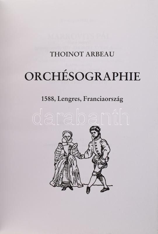 Thoinot Arbeau: Orchésopgraphie. 1588, Lengres, Franciaország. Ford.: Markovits Pál. (Sárborgárd, én, Bogárd és Vidéke-ny.), 195 p. Az eredeti címlap fakszimiléjével. Kiadói papírkötés.