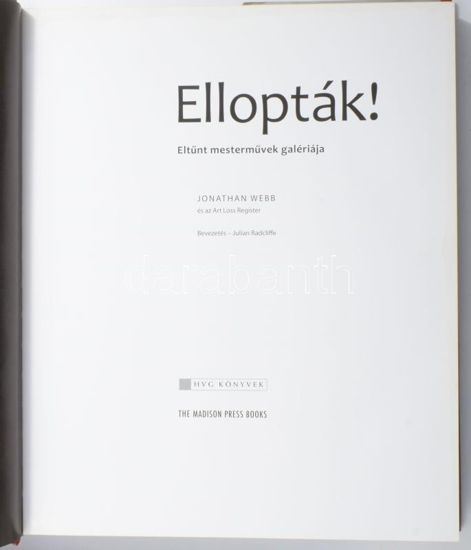 Webb, Jonathan: Ellopták! Eltűnt mesterművek galériája. Ford.: Garai Attila, Boross Anna. Bp., 2008, HVG. Gazdag képanyaggal illusztrálva. Kiadói kartonált papÃrkötés, kiadói papÃr védÅ‘borÃtóban, jó állapotban.