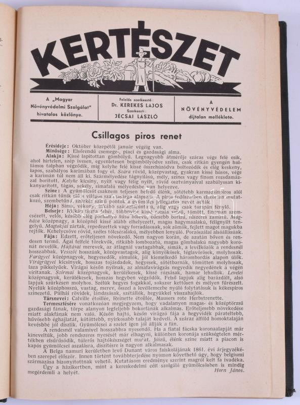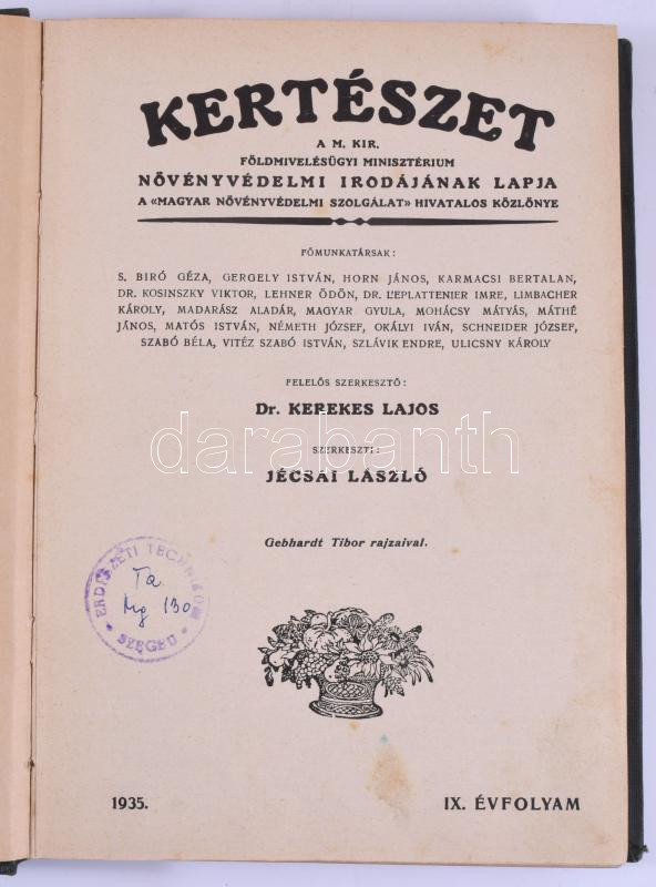 1935-1936 A Kertészet c. folyóirat IX. és X. évfolyamai egybekötve. Szerk.: Kerekes Lajos, Jécsai László. Gebhardt Tibor rajzaival. Bp., 1935-1936, Stephaneum-ny., IV+240 p.; IV+240 p. Félvászon-kötésben, intézményi bélyegzővel.