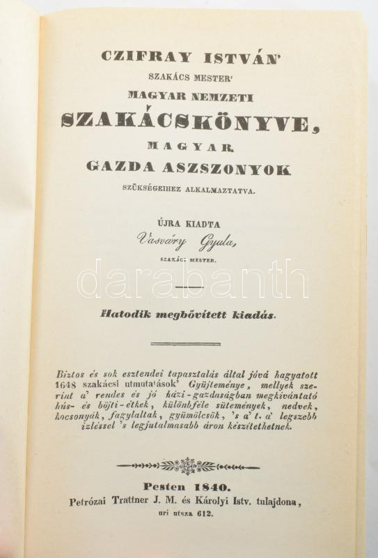 Czifray István szakács mester magyar nemzeti szakácskönyve. Bp., 1985, ÁKV. Az 1840-es Trattner-Károlyi-féle kiadás reprint kiadása. Kiadói kartonált papírkötés, kopott borítóval.;