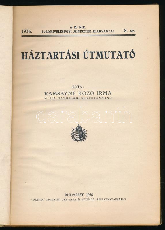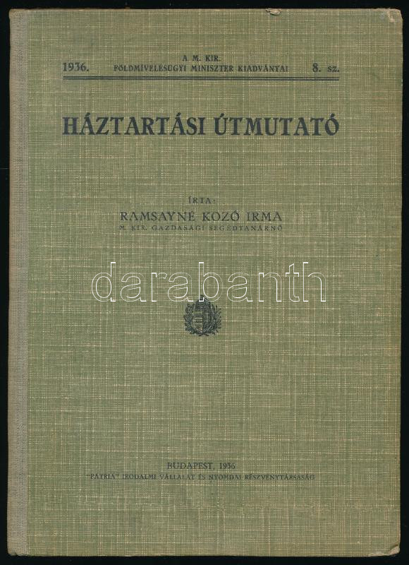 Description: Ramsayné Kozó Irma: Háztartási útmutató. A m. kir. földmívelésügyi miniszter kiadványai 8. sz. Bp., 1936, Pátria, 159+[1] p. Kiadói félvászon-kötés, minimálisan sérült borítóval.