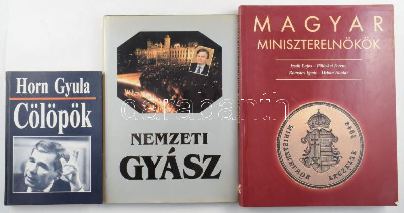 Description: 3 db könyv - Horn Gyula: Cölöpök. + Herényi-Bakos: Nemzeti gyász. Dr. Antall József (1932-1993). + Izsák-Pölöskei-Romsics-Urbán: Magyar miniszterelnökök 1848-2002. Kiadói kartonált kötés, jó állapotban.