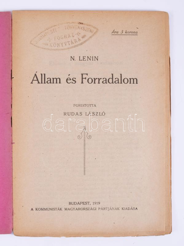 5 db marxista, munkásmozgalmi témájú kiadvány: Kautsky Károly: Marx Károly történelmi jelentősége. Ford.: Garami Ernő. Munkáskönyvtár 15. füzet. Bp., [1918], Népszava. Kiadói papírkötés, helyenként kis lapszéli sérülésekkel, felvágatlan. "Budapesti Forradalmi Törvényszék fogháza" bélyegzéssel. + Mi a Tanácsköztársaság?; Kun Béla: Ki fizet a háborúért?; Bucharin Nikoláj: Osztályharc és forradalom Oroszországban. Ford.: Szamuely Tibor.; Lenin: Állam és forradalom. Ford.: Rudas László. Kommunista Könyvtár. Bp., 1918-1919, Kommunisták Magyarországi Pártja. Kiadói papírkötés, változó állapotban.