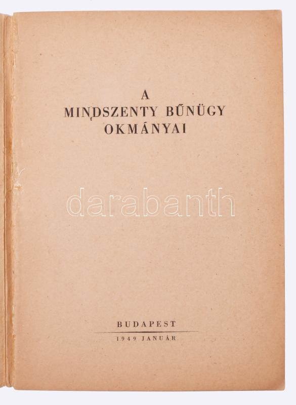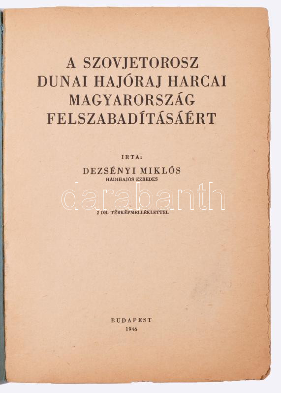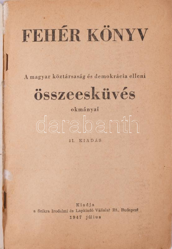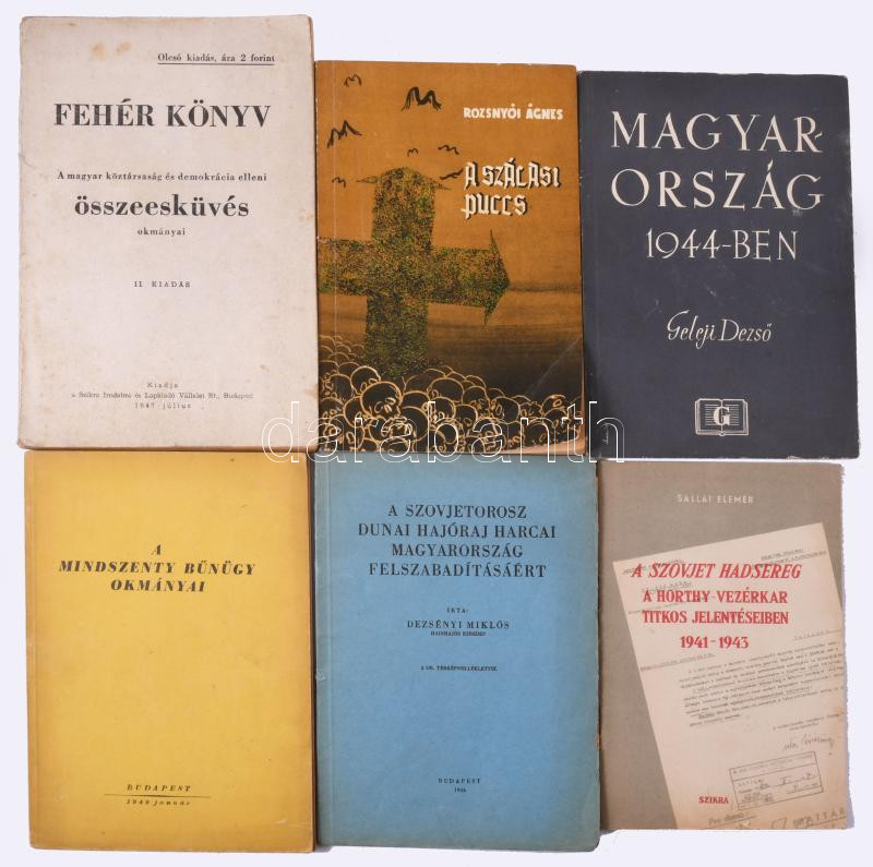 Description: 6 db könyv - A szovjet hadsereg a Horthy-vezérkar titkos jelentéseiben 1941-1943. Bp., 1955, Szikra. + A szovjetorosz dunai hajóraj harcai Magyarország felszabadításáért + A Mindszenty bűnügy okmányai + Fehér könyv. A magyar köztársaság és demokrácia elleni összeesküvés okmányai + Magyarország 1944-ben + A szálasi puccs. Kiadói papírkötés, kötetenként változó állapotban.