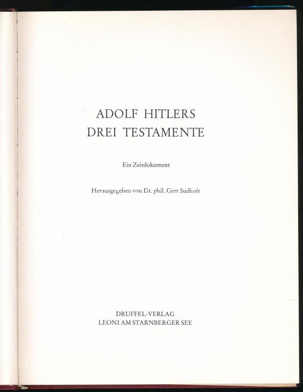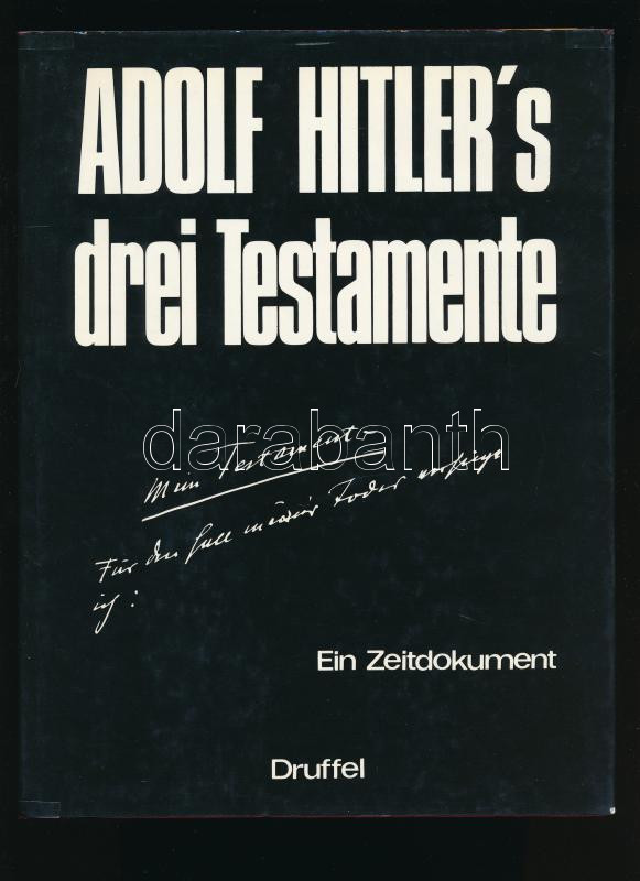 Adolf Hitlers drei Testamente. Ein Zeitdokument. Szerk.: Gert Sudholt.... https://www.darabanth.com/en/514-Auction-philately-postcards-numismatics-artwork-books-colletibles-jewelry/515.0/Books/Books-History~617/Adolf-Hitlers-drei-Testamente-Ein-Zeitdokument-Szerk-Gert-Sudholt-Berg-en-Druffel-Verlag-~II3476226