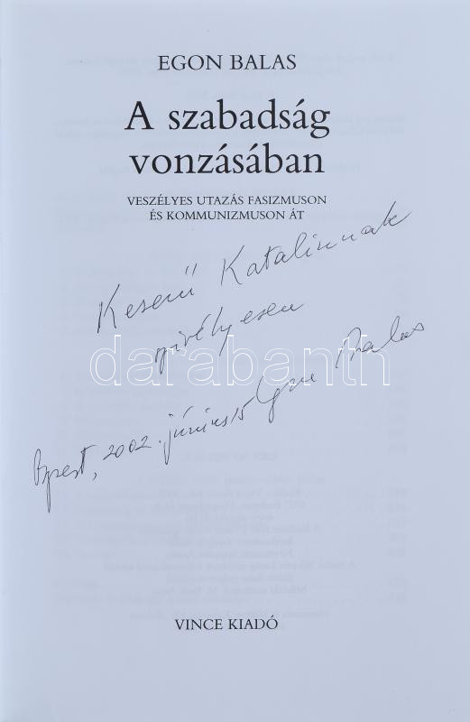 Description: Balas, Egon: A szabadság vonzásában. Veszélyes utazás fasizmuson és kommunizmuson át. DEDIKÁLT! Bp., 2002, Vince Kiadó. Kiadói kartonált kötés, papír védőborítóval, jó állapotban.
