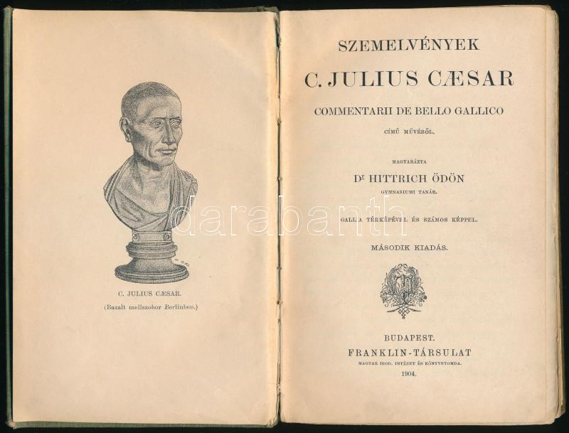 [Caesar, Caius Iulius]: Szemelvények C. Julius Caesar Commentarii de bello gallico cÃmű művébÅ‘l. Magyarázta: Hittrich Ödön. Bp., 1904, Franklin-Társulat, 162+[2] p., 71+[1] p.+ 1 (kihajtható térkép) t. Második kiadás. Egészvászon-kötésben, kissé viseltes, ázott borÃtóval.