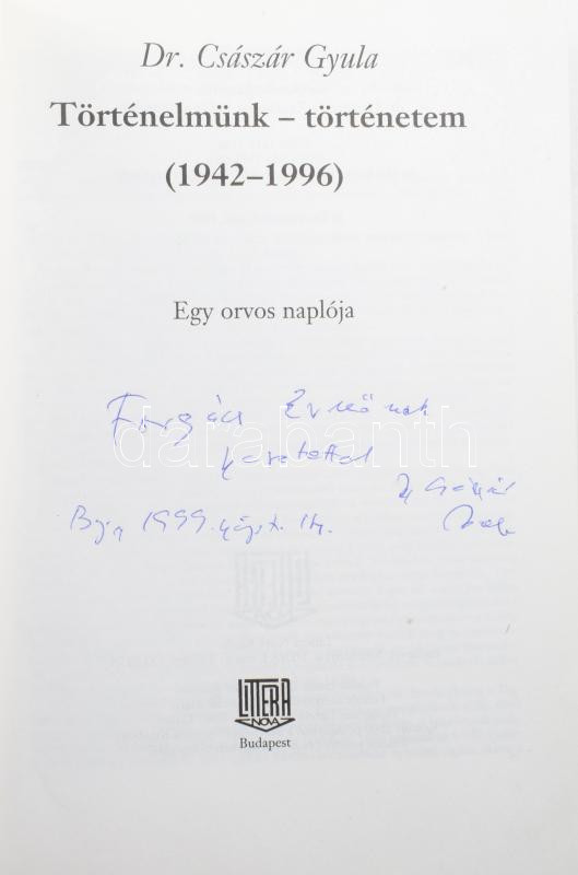 Description: Dr. Császár Gyula: A rendszerváltozás anatómiája (1989-1998). DEDIKÁLT! 1999, Littera Nova. + Dr. Császár Gyula: Történelmünk - történetem (1942-1996). Egy orvos naplója. DEDIKÁLT! 1997, Littera Nova. Kiadói papírkötés, jó állapotban.