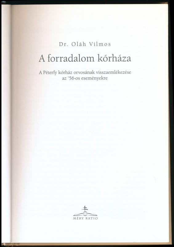 Description: Dr. Oláh Vilmos: A forradalom kórháza. A Péterfy kórház orvosának visszaemlékezése az '56-os eseményekre. 2006, Méry Ratio. Kiadói kartonált kötés, jó állapotban.