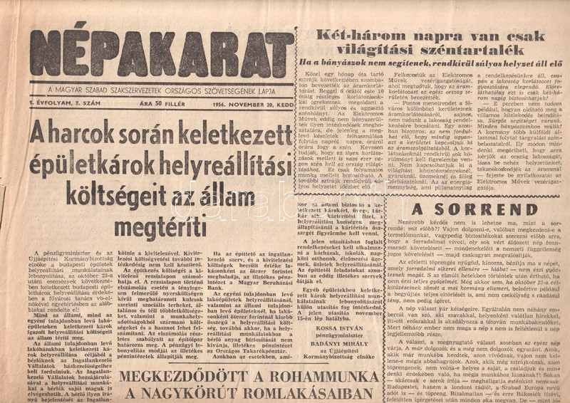 A forradalom napjaiban alakult, szociáldemokrata irányzatú szakszervezeti lap, a Népakarat a szabadságharc eltiprásának napjaiban, november 4-e után is megjelent. Kádár János kollaboráns kormánya ugyanis 1956 novemberében még nem uralta az országot olyan mértékben, hogy a forradalom emlékét ápoló lapok megjelenését korlátozza. A leplezetlen szovjet katonai jelenlét heteiben szakszervezeti lapszámunk beszámolhat a munkástanácsok munkájáról, a munkafelvétel és a munkamegtagadás dilemmájáról, illetve vezércikkben ítélheti el a Rákosi-Gerő-klikk uralmának terrorisztikus rendszerét. Érdekes módon lapszámunk a Magyar Írók Szövetségének tiltakozásának is helyet biztosít: az Írószövetség elutasítja a Marosán György elvtárstól (a kollaboráns kormány kulcsfigurájától) érkező rágalmakat. Lapszámunk ugyanakkor egyetlen szót sem ejthet a forradalmi munkás-paraszt kormány rendcsinálásáról, illetve a szovjet megszállás tényét sem kritizálhatja. Vezető publicisztikája végső soron a helyzettel való megbékélésre int: "A nép fenntartja legfőbb követeléseit: független, szabad életet akar. A munka szüneteltetése nem hoz életet - pusztulást hoz. Erre azt mondhatja valaki: ez a nép az életét tette a függetlenségre. Ám a munka szüneteltetése a függetlenséget nem hozza meg. A munka viszont meghozhatja. Sőt, napjaink történelmének egész logikája arra vall: meg is hozza".