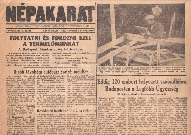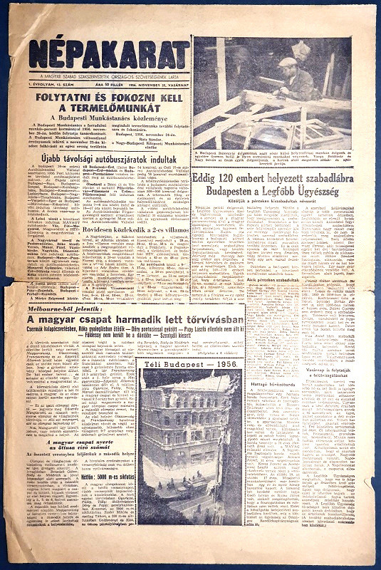 A forradalom napjaiban alakult, Nagy Imrét támogató, szociáldemokrata irányzatú szakszervezeti lap, a Népakarat a szabadságharc eltiprásának napjaiban, november 4-e után is megjelenhetett. Kádár János kollaboráns kormánya ugyanis 1956 novemberében még nem uralta az országot olyan mértékben, hogy a forradalom emlékét ápoló lapok megjelenését korlátozza. Szakszervezeti lapunk - feltehetően fennmaradásáért cserébe - napról napra jobban közelíti álláspontját a győztesekéhez. Ennek feltűnő példája, hogy lapszámunk teljes egészében közli a Pravda magyar eseményekről írt összefoglalóját (ideológiai eligazítását). A Pravda az októberi magyar események kiváltó okaként a Rákosi-Gerő-vezetés erőszakos módszereit jelöli meg. A tiltakozás nyomán hatalomra került Nagy Imre-kormány az események sodrában egyre inkább jobbra tolódott és gyengült, ennek nyomán a reakció színre lépése fenyegető veszélyként jelentkezett: e körülmények között került sor a Szovjetunió baráti segítségnyújtására. A Nagy Imre-kormány tevékenységét erőtlenségben és fasizálódásban összegző szovjet értékelést a magyar sajtó később átvette, sőt kiegészítette az imperialista összeesküvés vádjával, melynek nyomán Nagy Imrét később perbe foghatták és kivégezhették.