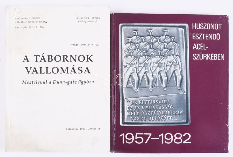 Description: Horváth József: A tábornok vallomása. Meztelenül a Duna-gate ügyben. Bp., 1990, Pallas Lap- és Könyvkiadó. Kiadói papírkötés + Huszonöt esztendő acélszürkében. Képek a munkásőrség életéből 1957-1982. Szerk. Ács György et al. Kiadói kartonált papírkötés.