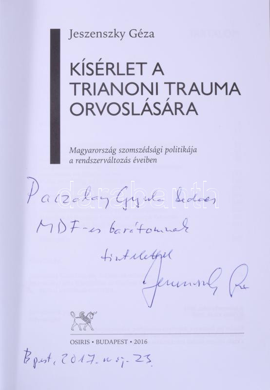 Jeszenszky Géza: Kísérlet a trianoni trauma orvoslására. A szerző, Jeszenszky Géza (1941-) történész, egyetemi tanár, politikus, külügyminiszter, diplomata által Paczolay Gyula (1930-2025) vegyészmérnök, közmondáskutató, tudománytörténész, egykori MDF-s harcostárs részére DEDIKÁLT példány. Magyarország szomszédsági politikája a rendszerváltás éveiben. Bp., 2016, Osiris, 394 p. Kiadói papírkötés.