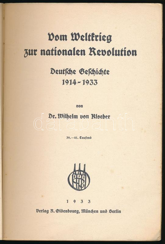 Description: Kloeber, Wilhelm von: Vom Weltkrieg zur nationalen Revolution. Deutsche Geschichte 1914-1933. München-Berlin, 1933, R. Oldenbourg, 154+[2] p. Német nyelven. Kiadói papírkötés, tulajdonosi bejegyzéssel.