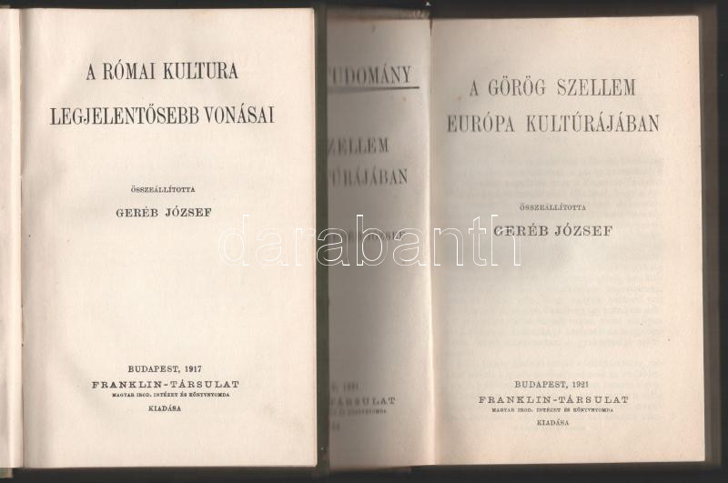 Description: Kultura és Tudomány sorozat 2 kötete: A római kultura legjelentősebb vonásai. + A görög szellem Európa kultúrájában. Összeál.: Geréb József. Bp., 1917-1921, Franklin-Társulat, 169+(3) p.; 223+(1) p. Kiadói félvászon-kötés / egészvászon-kötés, kissé kopottas, foltos borítóval, sérült/hiányzó elülső szennylappal, intézményi bélyegzőkkel.