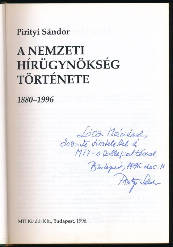 MTI Nemzeti Hírügynökség Története. Vezérig. karácsonyi üdvözlő soraival. DEDIKÁLT! Bp., 1996, MTI Kiadói Kft. Kiadói műbőr kötés, jó állapotban.