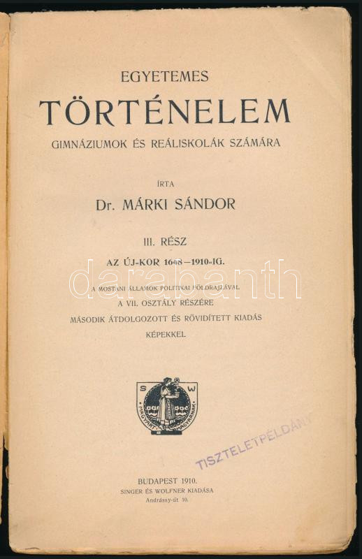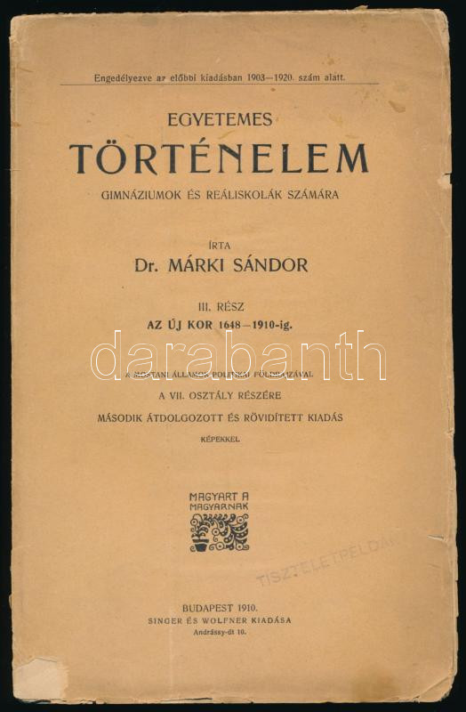 Márki Sándor: Egyetemes történelem gimnáziumok és reáliskolák számára.... https://www.darabanth.com/en/514-Auction-philately-postcards-numismatics-artwork-books-colletibles-jewelry/515.0/Books/Books-History~617/Marki-Sandor-Egyetemes-tortenelem-gimnaziumok-es-realiskolak-szamara-III-resz-Az-uj-~II3479124