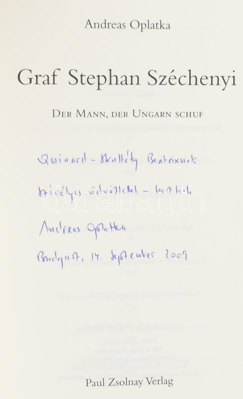 Oplatka, Andreas: Graf Stephan Széchenyi. Der Mann, der Ungarn schuf. DEDIKÁLT! Wien, 2004, Paul Zsolnay Verlag. Első kiadás! Kiadói kartonált kötés, jó állapotban. Az eredetileg német nyelven írt - majd egy évvel később az Osiris Kiadó gondozásában magyarul is kiadott - életrajz 2004 őszén Bécsben jelent meg. Szerzője magyar származású; tizennégy éves korában került Svájcba, ahol iskoláit végezte, s germanistaként és történészként egyetemi képzését kapta. A könyv Széchenyi Istvánt nemcsak mint magyar, hanem mint nagy európai politikust kívánja bemutatni.