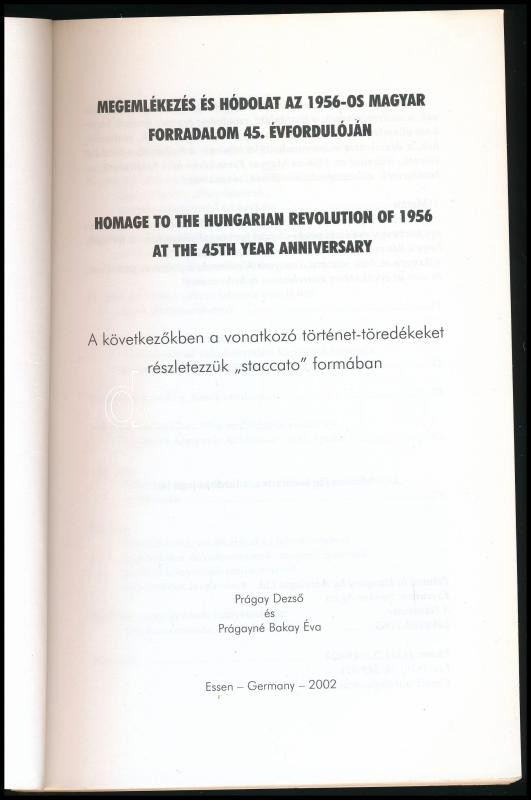 Description: Prágay Dezső - Prágayné Bakay Éva: Megemlékezés és hódolat az 1956-os Magyar Forradalom 45. évfordulóján. Essen, 2002. Kiadói papírkötés, kissé kopottas állapotban.