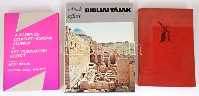 Vegyes könyvtétel, 3 db: P.R.S. Moorey: Bibliai tájak. Bp., 1984, Helikon. Gazdag képanyaggal. Kiadói egészvászon-kötés, papír védőborítóban + Incze Miklós (szerk.): A közép- és délkelet-európai államok a két világháború között. Bp., 1986, Akadémiai Kiadó. Kiadói kartonált papírkötés + Erich Wustman: A vörös hegyek indiánjai. Bp., 1960, Táncsics Könyvkiadó. Gazdag színes képanyaggal. Kiadói egészvászon-kötés