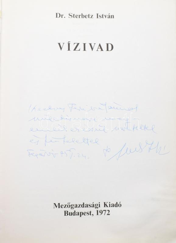 Sterbetz István: Vízivad. A szerző, Sterbetz István (1924-2012) orintológus által DEDIKÁLT példány. Bp.,1972, Mezőgazdasági Kiadó, 204+4 p. Szövegközti fekete-fehér fotókkal, és ábrákkal, és egészoldalas fekete-fehér és színes képekkel, illusztrációkkal illusztrált. Kiadói papírkötés, szakadt, javított papírborítóban.