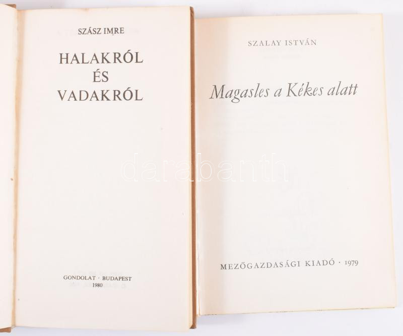 Szalay István: Magasles a Kékes alatt. Bp., 1979., MezÅ‘gazdasági, 125 p. Kiadói kartonált papÃrkötés. + Szász Imre: Halakról és vadakról. Bp., 1980., Gondolat. Kiadói egészvászon-kötés.