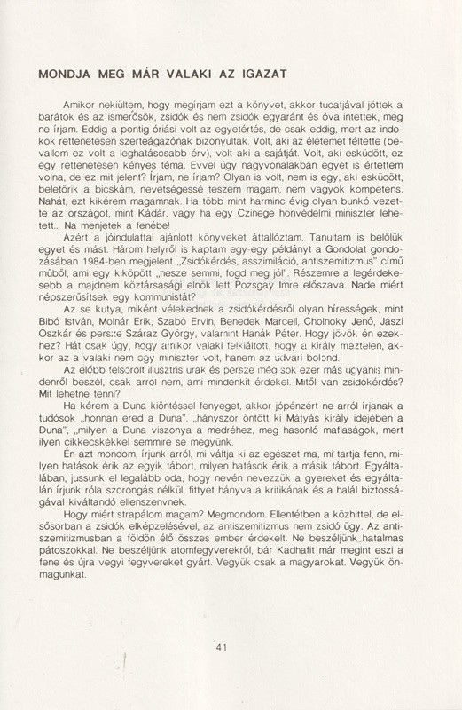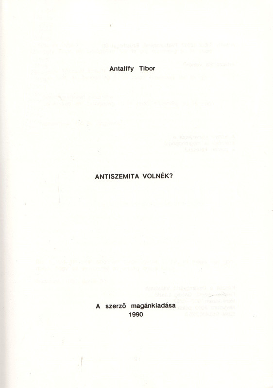 Az iskoláit Budapesten és Melbourne-ben végző Antalffy Tibor (sz. 1933) szabadgondolkodó, műszaki munkák fordítója zsidó és keresztény hitről vallott kritikai nézeteit fejti ki magánkiadású kötetében. A munka második része héber olvasásmód szerint kötve.