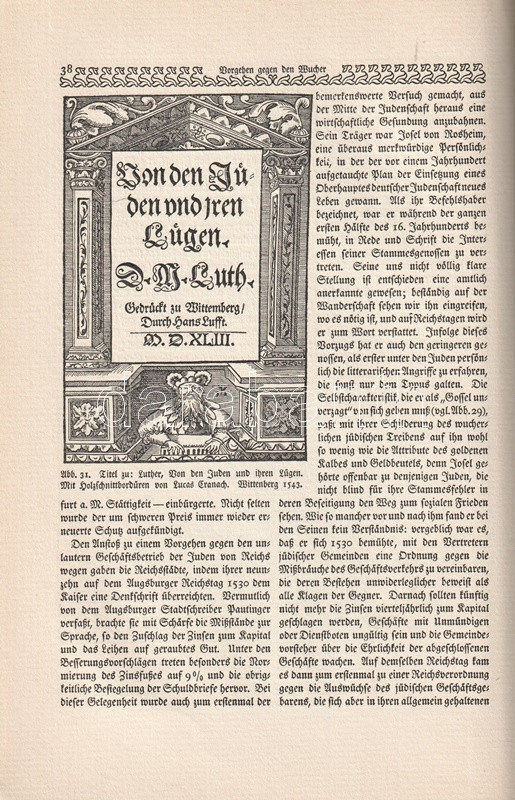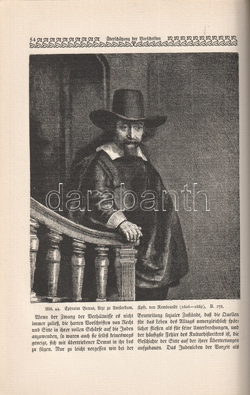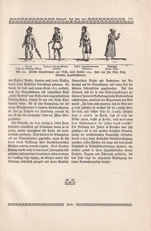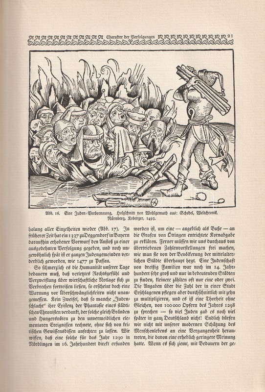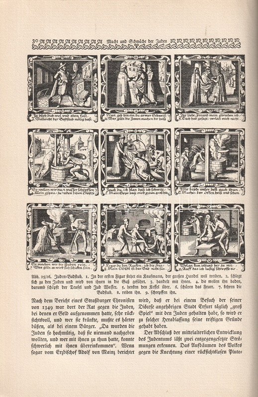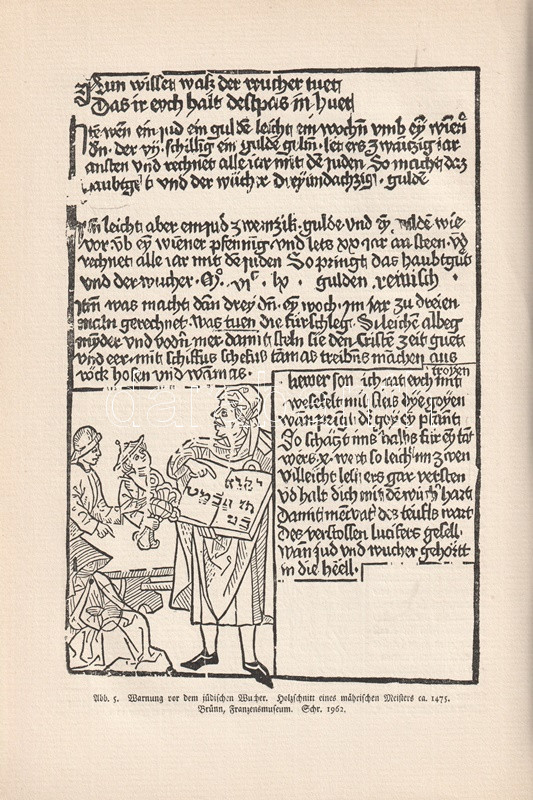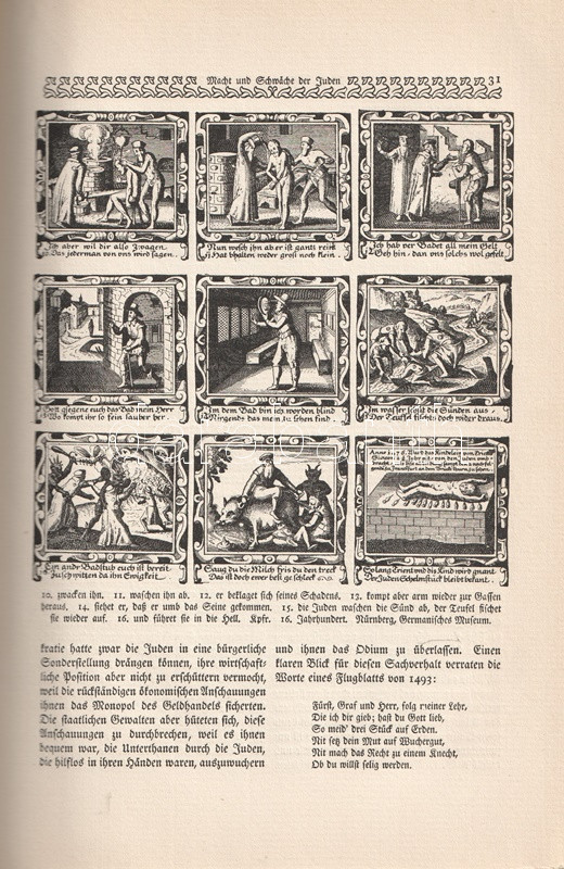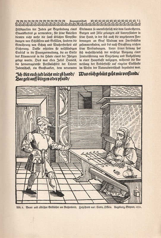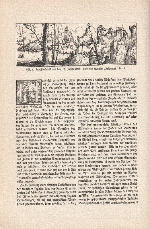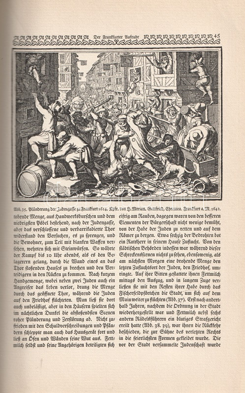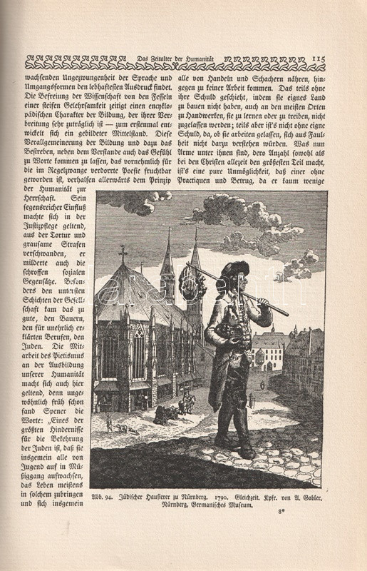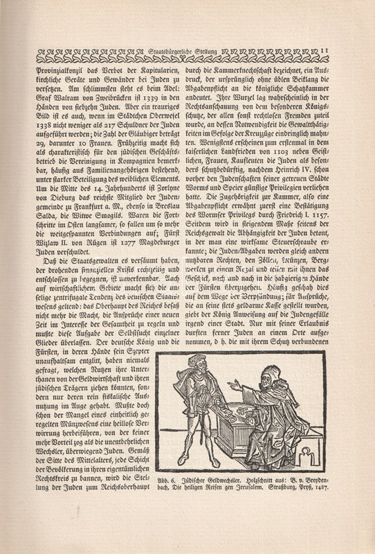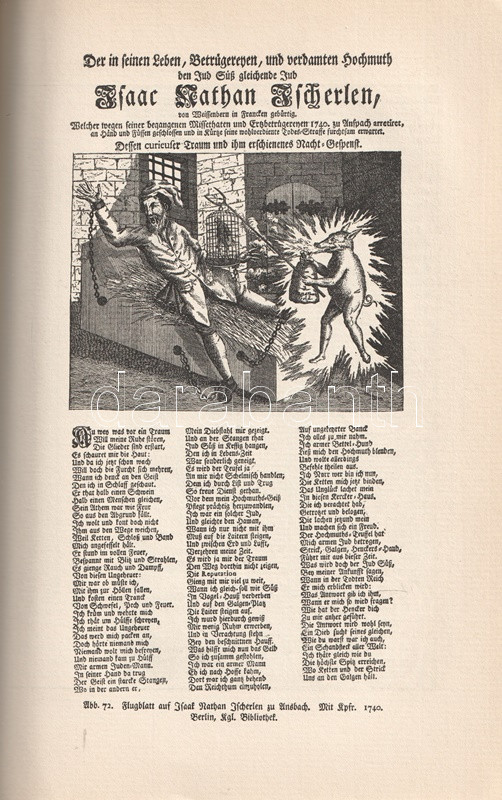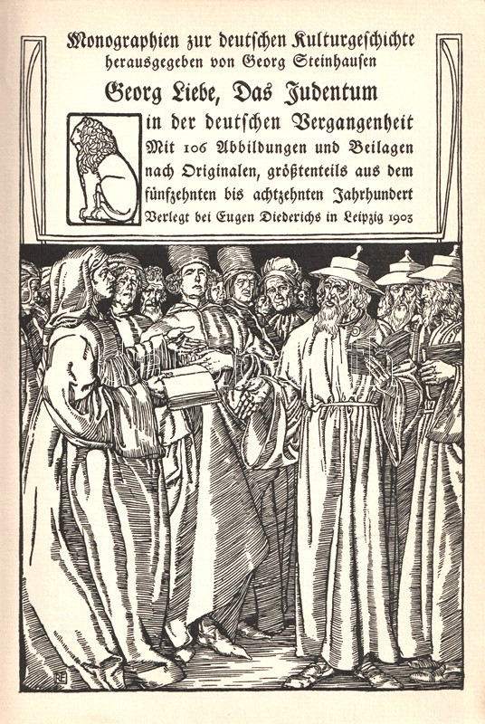 Szövegközti illusztrációkkal rendkívül gazdagon illusztrált, bibliofil kötetünk az 1899-1909 között tizenkét kötetben megjelent, illusztrált művelődéstörténet, a "Monographien zur deutschen Kulturgeschichte" című sorozat önmagában is megálló része. A sorozat valamennyi kötete egy-egy társadalmi réteg történetét tekinti át, a németországi katonaság, nemesség, kézművesség, parasztság és a németországi gyermeklét társadalomtörténetének áttekintése után kötetünk a sokáig gettóban élő németországi zsidóság történetével foglalkozik. Kötetünk rajzai 15-18. századi népkönyvekből származnak, nyitóképét Robert Engels (1866-1926) grafikusművész készítette.