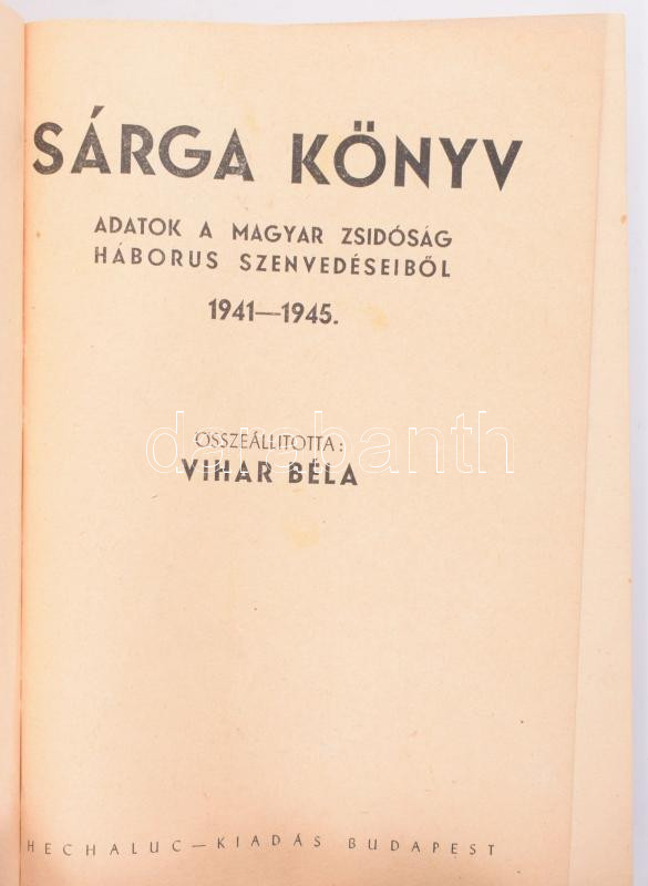 Sárga könyv. Adatok a magyar zsidóság háborús szenvedéseiből. 1941-194... https://www.darabanth.com/en/514-Auction-philately-postcards-numismatics-artwork-books-colletibles-jewelry/515.0/Books/Books-Judaica~627/Sarga-konyv-Adatok-a-magyar-zsidosag-haborus-szenvedeseibol-1941-1945-Osszeall-Vihar-~II3479904