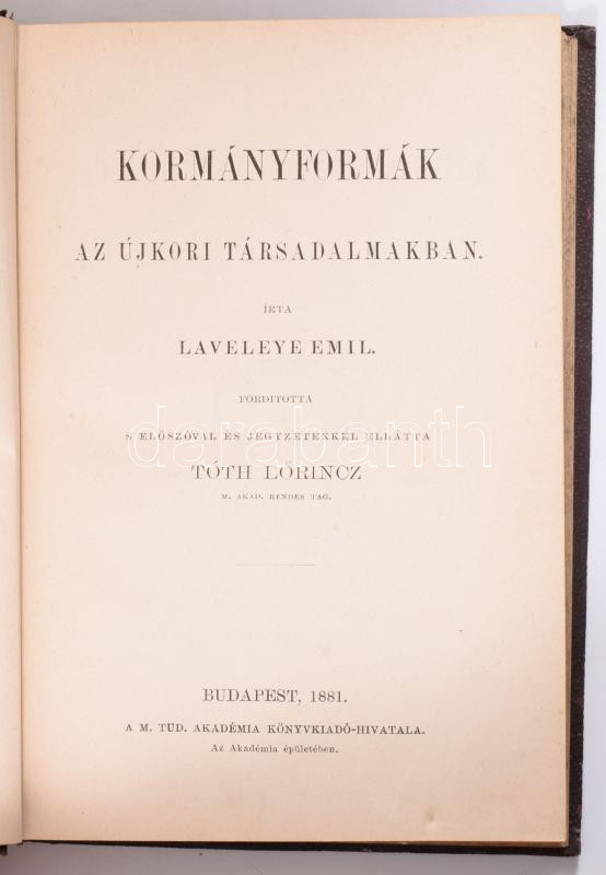 Description: Laveleye, Émile [Louis Victor de]: Kormányformák az újkori társadalmakban. Ford., előszóval és jegyzetekkel ellátta: Tóth Lőrincz. Bp., 1881, M. Tud. Akadémia Könyvkiadó-hivatala, XVIII+180 p. Aranyozott gerincű vászon-kötés, márványozott lapélekkel