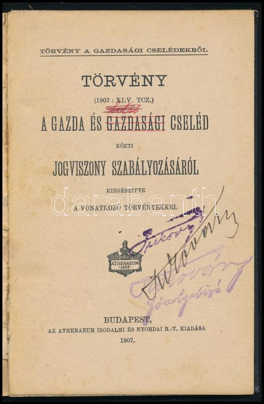 Description: Törvény a gazda és cseléd közti jogviszony szabályozásáról kiegészítve a vonatkozó törvényekkel. Bp., 1907, Athenaeum. Félvászon kötés, gerincnél szakadt, kopottas állapotban.