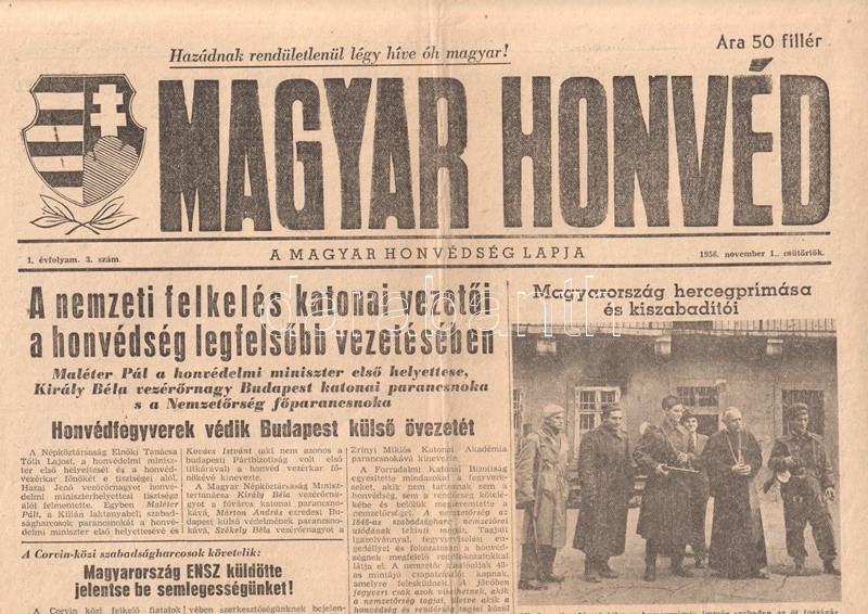 [Folyóirat, 1956.] A nemzeti felkelés katonai vezetői a honvédség legfelsőbb vezetésében. Honvédfegyverek védik Budapest külső övezetét. Mindszenthy Józsefet katonáink szabadították ki fogságából. Kitört a háború Közel-Keleten. A Magyar Honvéd lapszáma a forradalom napjaiból. I. évfolyam, 3. szám. (1956. november 1.)