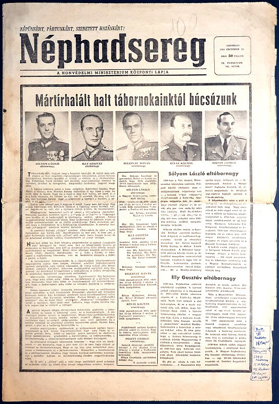 [Folyóirat, 1956.] Mártírhalált halt tábornokainktól búcsúzunk. A Néphadsereg politikai folyóirat lapszáma a Tábornok-perben kivégzett katonatisztek újratemetése alkalmából. IX. évfolyam, 241. szám. (1956. október 13.)