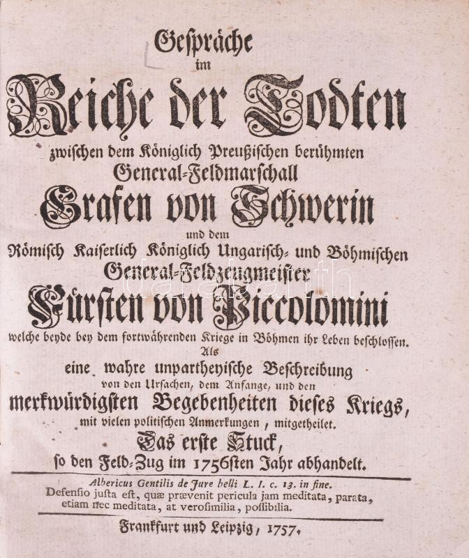 Gespräche im Reiche der Todten, zwischen Dem Königlich Preußischen General-Feld-Marschall, Grafen von Schwerin, und dem Römisch Kaiserlich Königlich Ungarisch- und Böhmischen General- Feldzeugmeister Fursten von Piccolomini. I-X. Stücke. [Das erste bis das zehende Stück.] Welche beyde bey dem fortwährenden Kriege in Böhmen ihr Leben beschlossen. Als eine wahre unpartheyische Beschreibung von den Ursachen, dem Anfange, und den merkwürdigsten Begebenheiten dieses Kriegs. Frankfurt und Lepizig, 1757-1758, nyn.,1 (rézmetszetű csata térképvázlat) t.+1 (Erklärung des Titelkupfers) sztl. lev. + 6+56; +2+[57]-110 p.+1 (színezett rézmetszet csata térképvázlat) t ; + 2+[111]-172 p.+1 (színezett rézmetszet csata térképvázlat) t ; +2+54 p.+1 (színezett rézmetszet csata térképvázlat) t ; +2+54 p.+1 (színezett rézmetszet csata térképvázlat) t ; +2+54 p.; +2+54 p.+1 (színezett rézmetszet csata térképvázlat) t.; +2+46 p.; +2+54 p.+1 (színezett rézmetszet csata térképvázlat) t.;+2+54 p.+1 (színezett rézmetszet csata térképvázlat) t.;