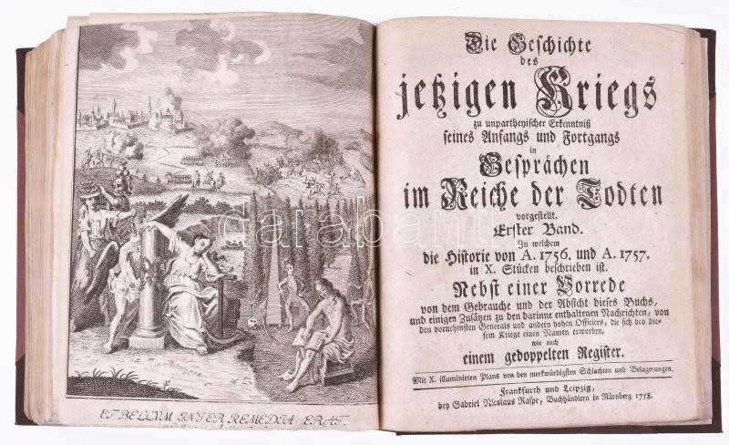 [Richter, Christoph Gottlieb (1717-1774)]: Die Geschichte des jetztigen Kriegs zu unpartheyischer Erkenntniß seines Anfangs und Fortgangs in Gesprächen im Reiche der Todten vorgestellt. Erster Band. Frankfurth - Leipzig, 1758, Gabriel Nicolaus Raspe, 1 (rézmetszetű címkép) t. +[18]+52 p.