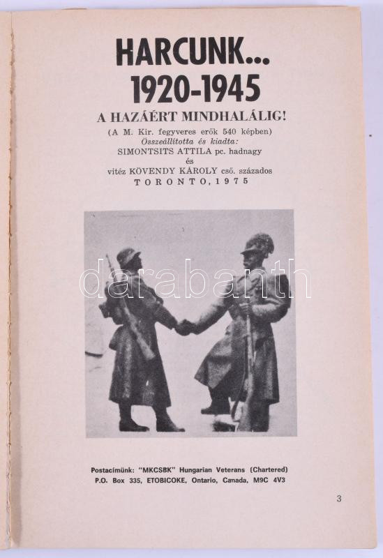 Description: Simonsits Attila - vitéz Kövendy Károly: Harcunk... 1920-1945. DEDIKÁLT Kövendy Károly által! Toronto, 1975. Emigráns kiadás. Kiadói papírkötés, papír védőborítóval, első lap kijár, egy lap hiányzik (127/128), kopottas állapotban.