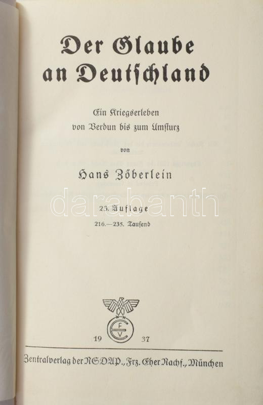 Description: Zöberlein, Hans: Der Glaube an Deutschland. Ein Kriegserleben von Verdun bis zum Umsturz. München, 1937, Zentralverlag der NSDAP, 1 t.+ 890+[6] p. Német nyelven. Kiadói egészvászon-kötés.