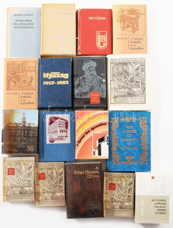 Vegyes nyomdászattal, tipográfiával, és könyvnyomtatással kapcsolatos minikönyvtétel, 17 db. Közte könyvnyomtatás Magyarországon 1-3, Veres László: A miskolci nyomdászat kezdetei 1., Nagy Zoltán: A magyar betűöntés a 19., és 20. században, Mauthner, József: The father of printing in Hungary. ...stb.