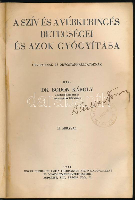 Bodon Károly: A szív és a vérkeringés betegségei és azok gyógyítása. Orvosoknak és orvostanhallgatóknak. Bp., 1934. Félvászon kötés, foltos lapok, tulajdonosi névbejegyzéssel.