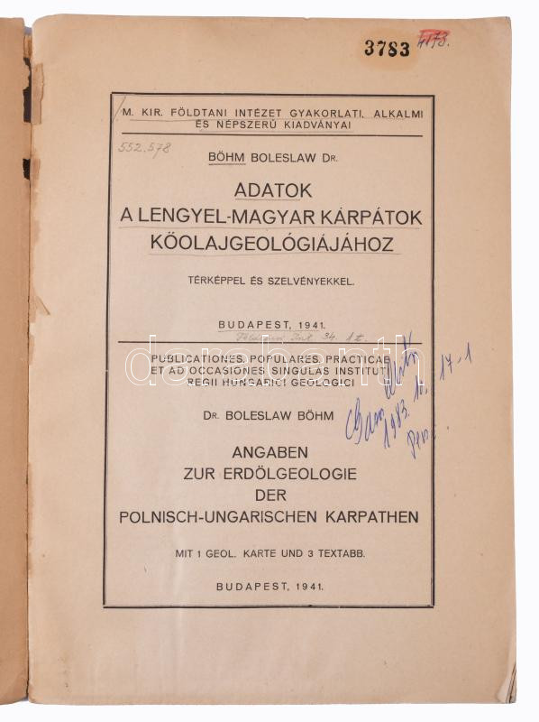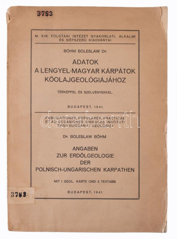 Dr. Böhm Boleslaw: Adatok a lengyel-magyar Kárpátok kőolajgeológiájához. Térképpel és szelvényekkel. Bp., 1914, M. Kir. Földtani Intézet. 34 p. + 1 kihajtható térképmelléklet. Kiadói sérült papírkötés, volt könyvtári példány.