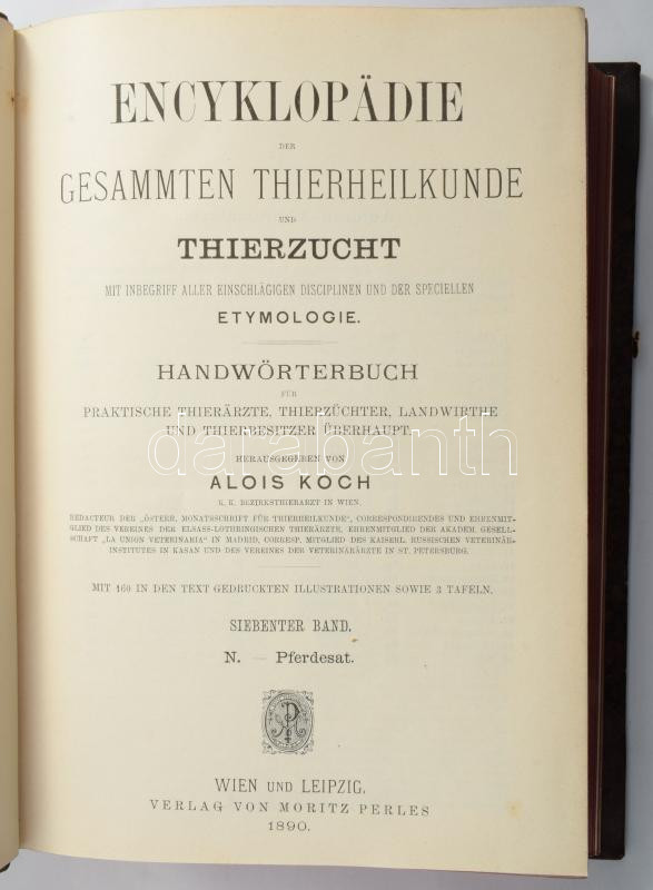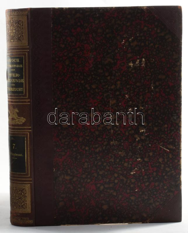 Koch, Alois (szerk.): Encyklopädie der gesammten Thierheilkunde und Thierzucht. Mit Inbegriff aller einschlägigen Disciplinen und der speciellen Etymologie. 7. Band. N. - Pferdesat. Wien-Leipzig, 1890, Moritz Perles, [4]+613+[7] p. Német nyelven. Aranyozott gerincű félbőr-kötésben, festett lapélekkel, kissé viseltes borítóval, belül a lapok nagyrészt jó állapotban.