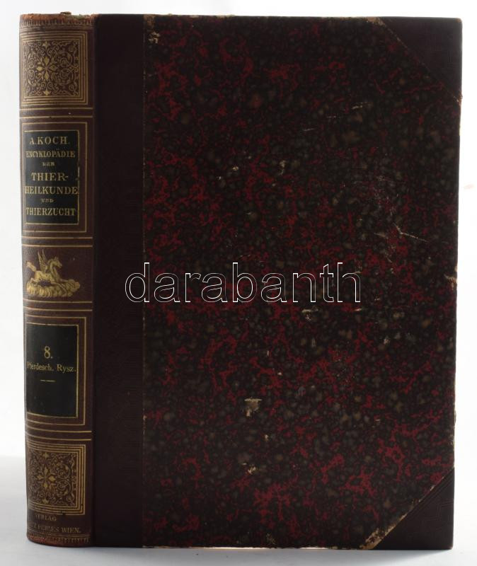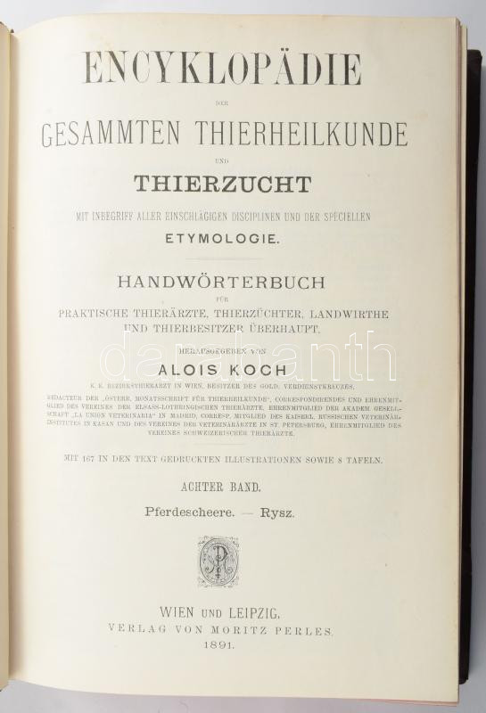 Koch, Alois (szerk.): Encyklopädie der gesammten Thierheilkunde und Thierzucht. Mit Inbegriff aller einschlägigen Disciplinen und der speciellen Etymologie. 8. Band. Pferdescheere. - Rysz. Wien-Leipzig, 1890, Moritz Perles, [4]+617+[51] p. Német nyelven. Aranyozott gerincű félbőr-kötésben, festett lapélekkel, kissé viseltes borítóval, belül a lapok nagyrészt jó állapotban.