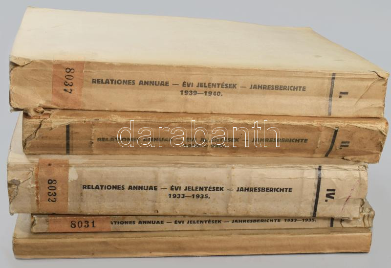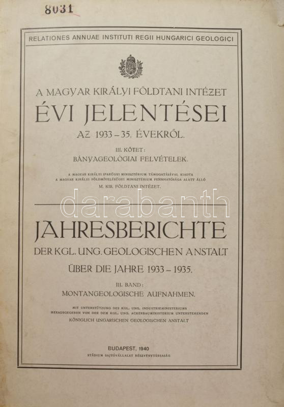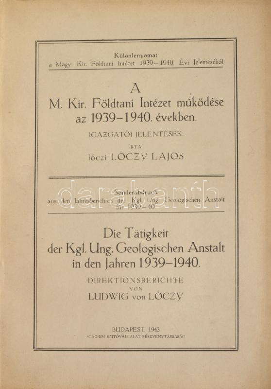 Magyar Kir. Földtani Intézet évi jelentései az 1933-35. évi évekről. III-IV. köt./ az 1936-1938. évekről II. köt./az 1939-1940. évekről. I. köt. Bp., 1940-1943, Stádium, 2+[1125]-1330+2+24 p.+2+IV+VI t.;4+[1337]-1972 p.+21 t.;2+[561]-1122+27 p.+15 t.; XI+544 p.+8 t. Kiadói papírkötések, egy foltos borítóval, szakadt borítókkal és gerincekkel, de belül jó állapotban, régi intézményi bélyegzésekkel. + Lóci Lóczy Lajos: A M. Kir. Földtani Intézet működése az 1939-1940. években. Igazgatói jelentések. Bp., 1943, Stádium, 2+242 p.+ 4 (M. Kir. Földtani Intézet által 1940-ig végzett újrendszerű felvételek átnézetes térképe, A ruténföldi alsómiocén sósagyagformáció paleográfiai térképe, Az Alsó-Máramarosi, Huszt-Aknaszlatina vidéki sóhegység geológiai térképe, Lóczy Lajos: Ruténföld gazdasággeológiai térképe) t. Kiadói papírkötés. Kiadói papírkötés.