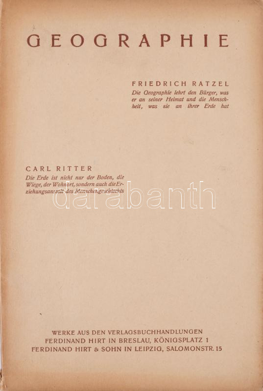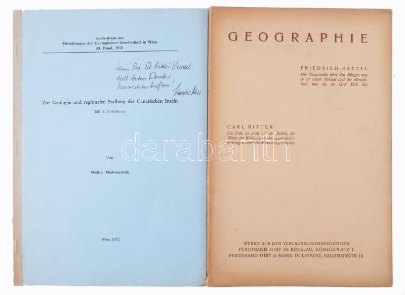Ratzel, Friedrich - Ritter, Carl: Geographie. Breislau-Leipzig, 1926, Ferdinand Hirt, 64 p. Fekete-fehér képekkel illusztrálva. Német nyelven. Kiadói papírkötés. + Zur Geologie und regionalen Stellung der Canarischen Inseln Mit 1 Abbildung von Walter Medwenitsch. Wien, 1972, Miteilungen der Geologischen Gesellschaft in Wien. Német nyelven. Kiadói papírkötés.