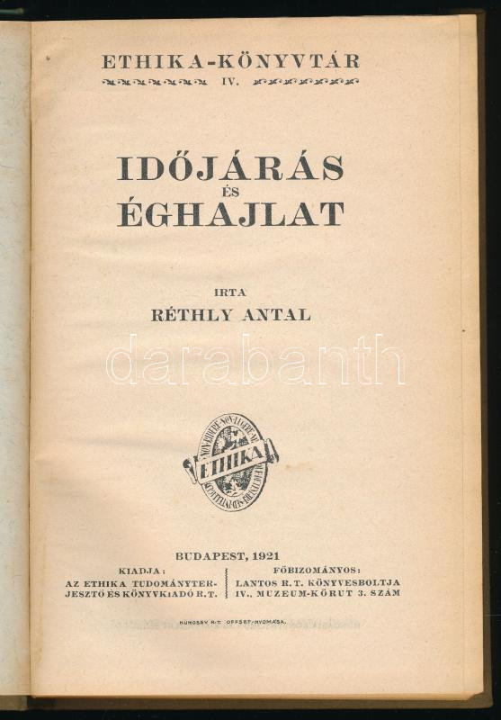 Réthly Antal: Időjárás és éghajlat. Bp., 1921, Pátria. Kiadói foltos egészvászon kötés, kopottas állapotban.
